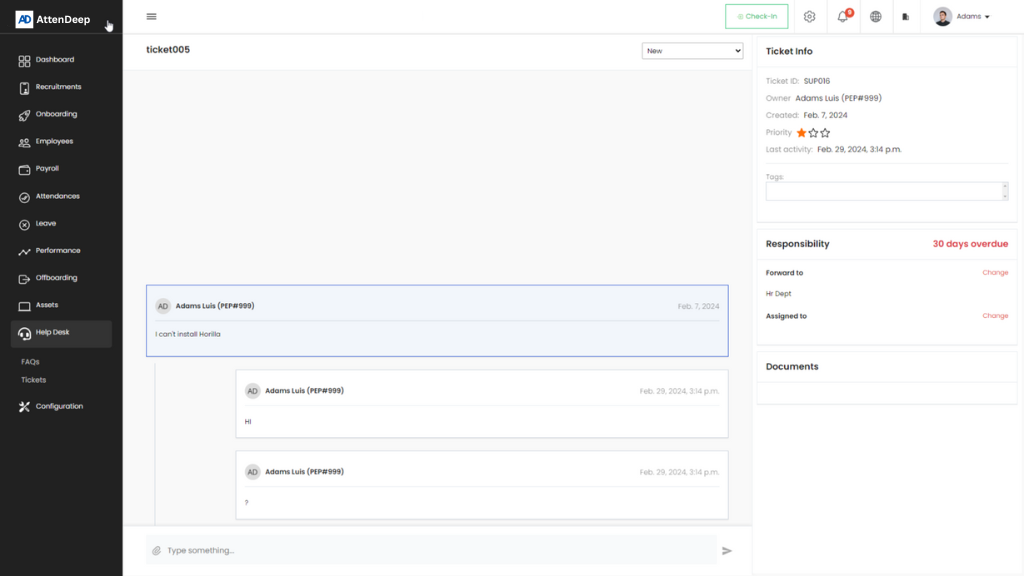 AttenDeep’s Helpdesk makes it easy for employees to connect with HR. Raise tickets, choose the right department, and track every update in one place. HR managers can assign tickets to the right team members, who can reply or ask for more details. Everything about your ticket stays organized and accessible in the Tickets section.