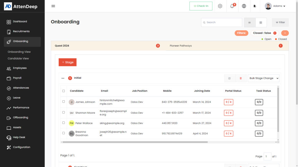 The Onboarding View in AttenDeep HRMS acts as the central interface for managing newly hired candidates before their official onboarding begins. Designed to simplify the process, it gives HR teams a clear and user-friendly platform to manage onboarding tasks and stages—organized around each recruitment. This helps ensure a smooth transition from hiring to onboarding for every new employee.