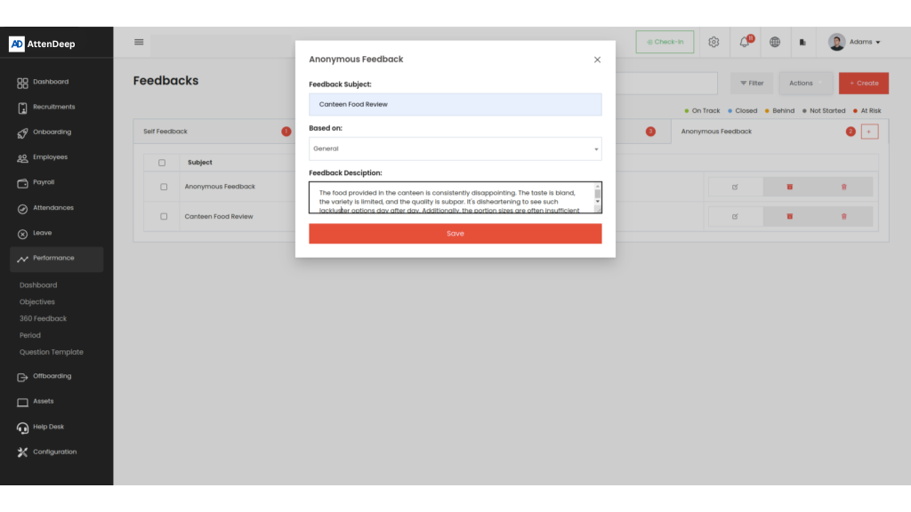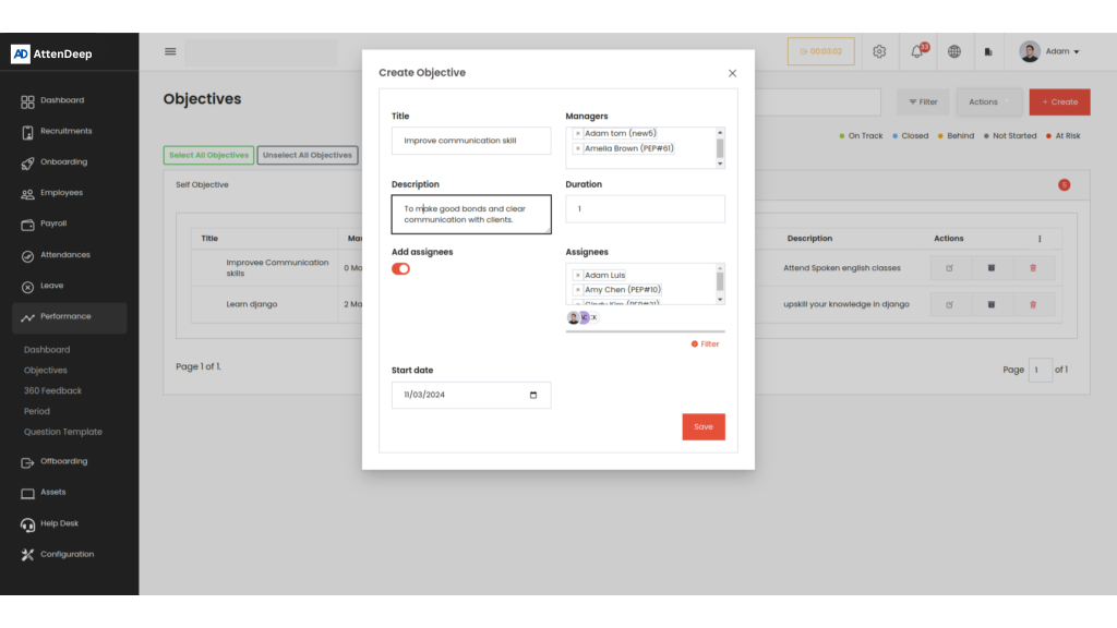 AttenDeep’s Performance Management System promotes accountability and growth through OKRs and 360-degree feedback. It enables clear goal-setting, real-time progress tracking, and valuable performance insights to support continuous improvement.