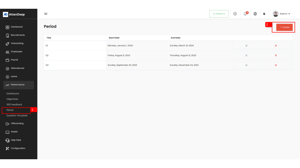 The Period List View in AttenDeep offers a centralized way to manage and track time periods used across HR and performance management tasks. By defining start and end dates for each period, you can ensure that OKRs and feedback cycles stay aligned with your organization’s goals. Built-in update and delete options make it easy to adjust or remove periods as needed. This view helps streamline workflows by providing a clear structure for managing time-based processes within your HR strategy.