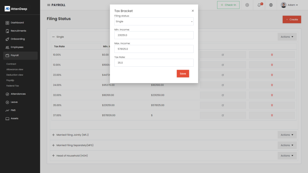 AttenDeep Payroll Management Software simplifies tax calculations with a user-friendly interface. You can define tax brackets based on filing statuses, assign tax rates to income ranges, and tailor tax descriptions as needed. The system automates tax deductions to ensure accurate withholdings for each employee. With AttenDeep HRMS, managing taxes becomes effortless—supporting compliance, accuracy, and streamlined payroll processing.