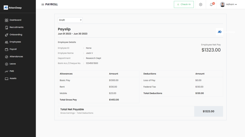 Generate professional and detailed payslips effortlessly with AttenDeep HRMS. The payroll system automatically calculates employee salaries, including allowances, deductions, and taxes, ensuring accurate and comprehensive payslips for each pay period. This streamlined process enhances transparency, supports compliance, and saves valuable time for HR teams.