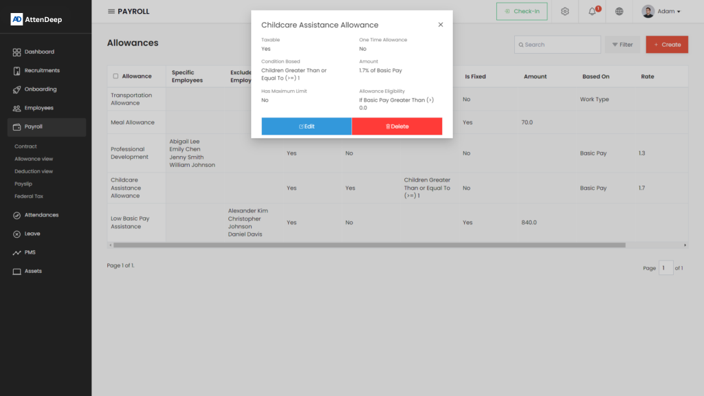 AttenDeep Payroll Software offers a user-friendly interface for managing a wide range of employee allowances. It allows you to define various allowance types, set eligibility criteria, and specify whether each allowance is fixed or variable. Allowances can be easily assigned to specific employee groups, with the option to set maximum limits when required. AttenDeep HRMS streamlines the administration of employee benefits, ensuring compliance with organizational policies and promoting fairness in compensation.