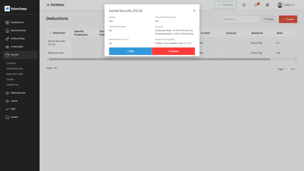 AttenDeep Payroll Software provides an intuitive interface for managing various types of employee deductions efficiently. You can create and configure deductions, define eligibility criteria, and choose between fixed or variable amounts. Deductions can be assigned to specific employee groups, with the option to set maximum limits when needed. AttenDeep HRMS simplifies the deduction process, supports policy compliance, and ensures fairness in compensation management.